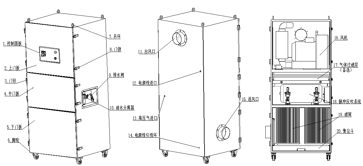 SRA-950XP脈沖反吹清灰凈化機(jī)高壓風(fēng)機(jī)和三層過濾系統(tǒng)組合而成。