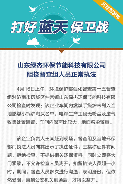 | 4月16日上午,環(huán)保部督查組對山東綠杰環(huán)保節(jié)能科技執(zhí)法受阻一事引起[吊頂式空氣凈化機]環(huán)保行業(yè)人士一眾關注;由于該公司電焊生產工段無粉塵及廢氣手機處置裝置,車間內噪聲異常打,地面粉塵嚴重等各種原因,環(huán)保督察組對其依法采取相應措施,貴公司以證件有問題,拒絕檢查,同事扣留執(zhí)法人員超一小時,