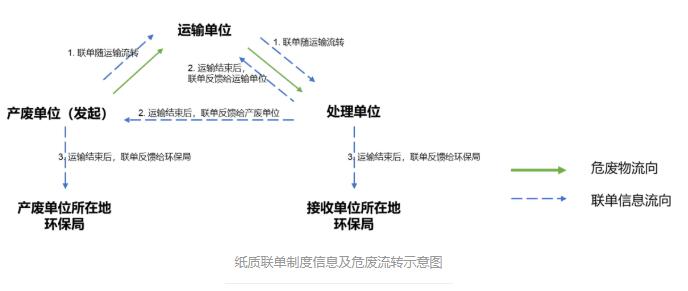 隨著我國工業化和城市經濟的高速發展,工業廢物、生活廢物以及醫療廢物的產生量急劇增加,其中對人體健康、土壤、水體等危害更大的危險廢物也大大增加,整個2018年的危廢產量達到7500萬噸,與2011年相比翻了一番。如果危險廢物處理不當,則會對環境以及人類造成巨大危害,甚至導致疾病和死亡。如何能更加有效、環保、徹底處理或穩定化這些危險廢物,成為當今世界關注的重大問題。 在過去的一年里,生態環境部新增了包括固體廢物與化學品司,危險廢物也在固體廢物與化學品司管理范圍內。緊隨其后的是“清廢行動2018”轟轟烈烈拉開架勢,加強了對固廢以及危廢產生企業的監管和督查,大量被查出來的固廢危廢將進入正規處置渠道。在長江經濟帶沿岸地區,工信部也對工業固廢展開大排查。同時,新版《環境保護稅法》頒布,山東、四川、廣東等省危廢相關細則紛紛落地,對于違反相關法律的行為也都遵從“從重處罰”的原則。 目前傳統的對危險廢物轉移過程的監管主要實行的是“紙質聯單制度”,即轉移過程中的關鍵信息和數據由參與方記錄在聯單上,最后寄給相關的政府環保部門進行監管(如下圖所示)。此種制度存在流轉效率低,數據準確性不可控,聯單的保存與管理成本高等問題。